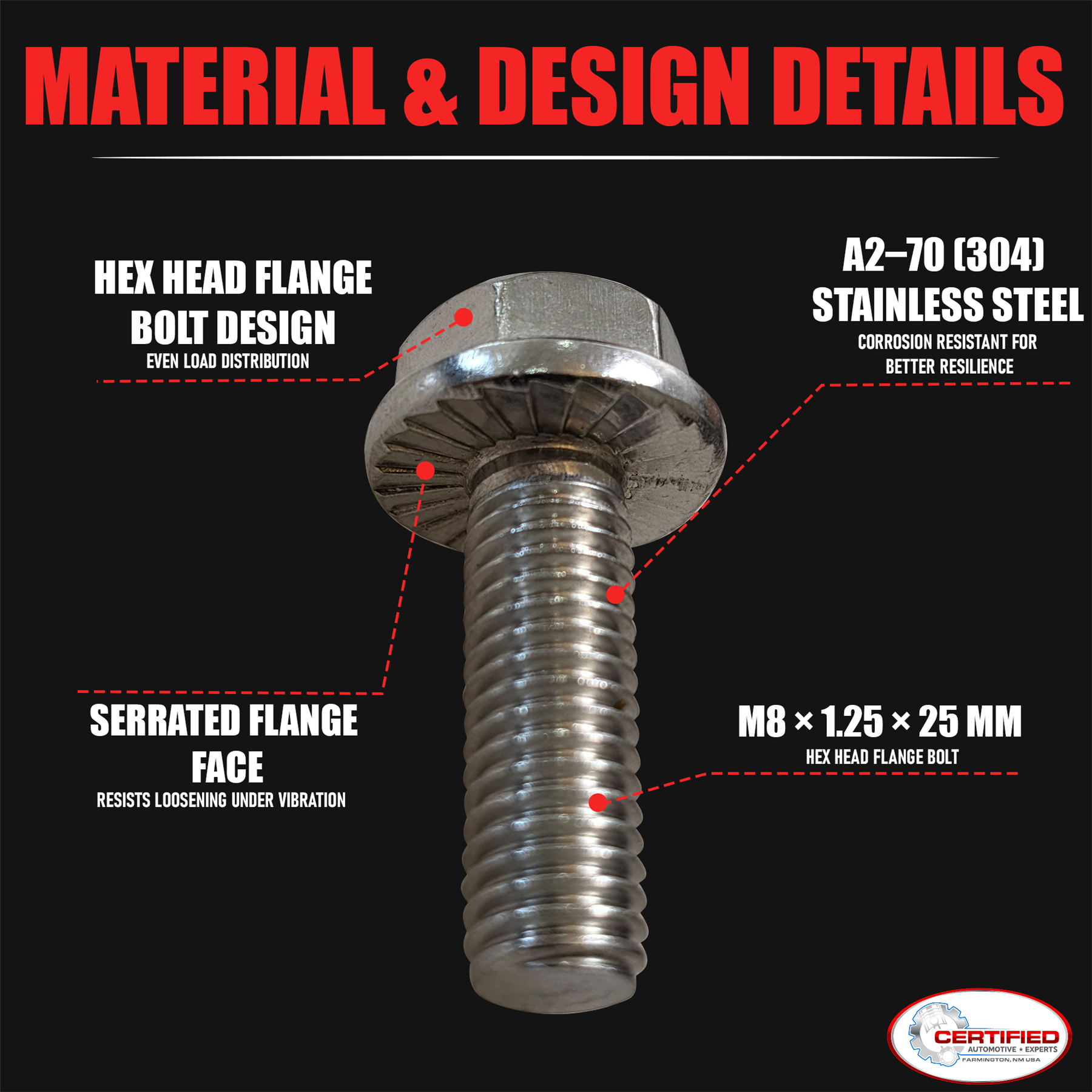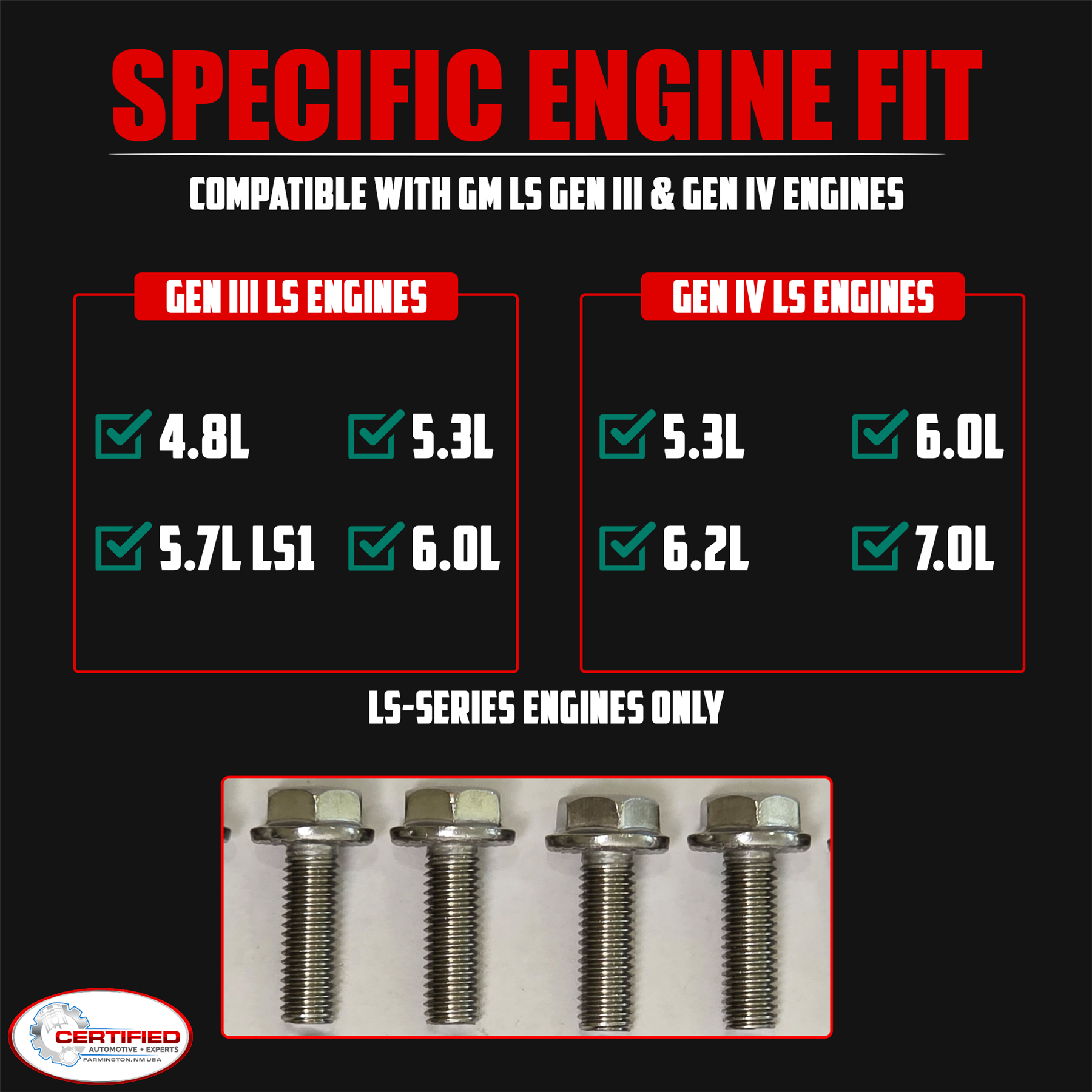 Upgrade Your LS Exhaust System with the CAE LS Exhaust Header Manifold Bolt Kit. This 12-piece set is made from premium 304 stainless steel for maximum strength, heat resistance, and durability. Designed to fit GM LS series engines, these bolts provide reliable fastening for both OEM manifolds and aftermarket headers. Compatible with 4.8L, 5.3L, 5.7L, 6.0L, and 6.2L engines, they are perfect for stock replacements, header installations, and LS engine builds. Each bolt features a hex flange head design for a secure, leak-resistant installation without the need for additional washers. Built for long-term performance, CAE header bolts offer excellent corrosion resistance and a precision fit for your exhaust system needs