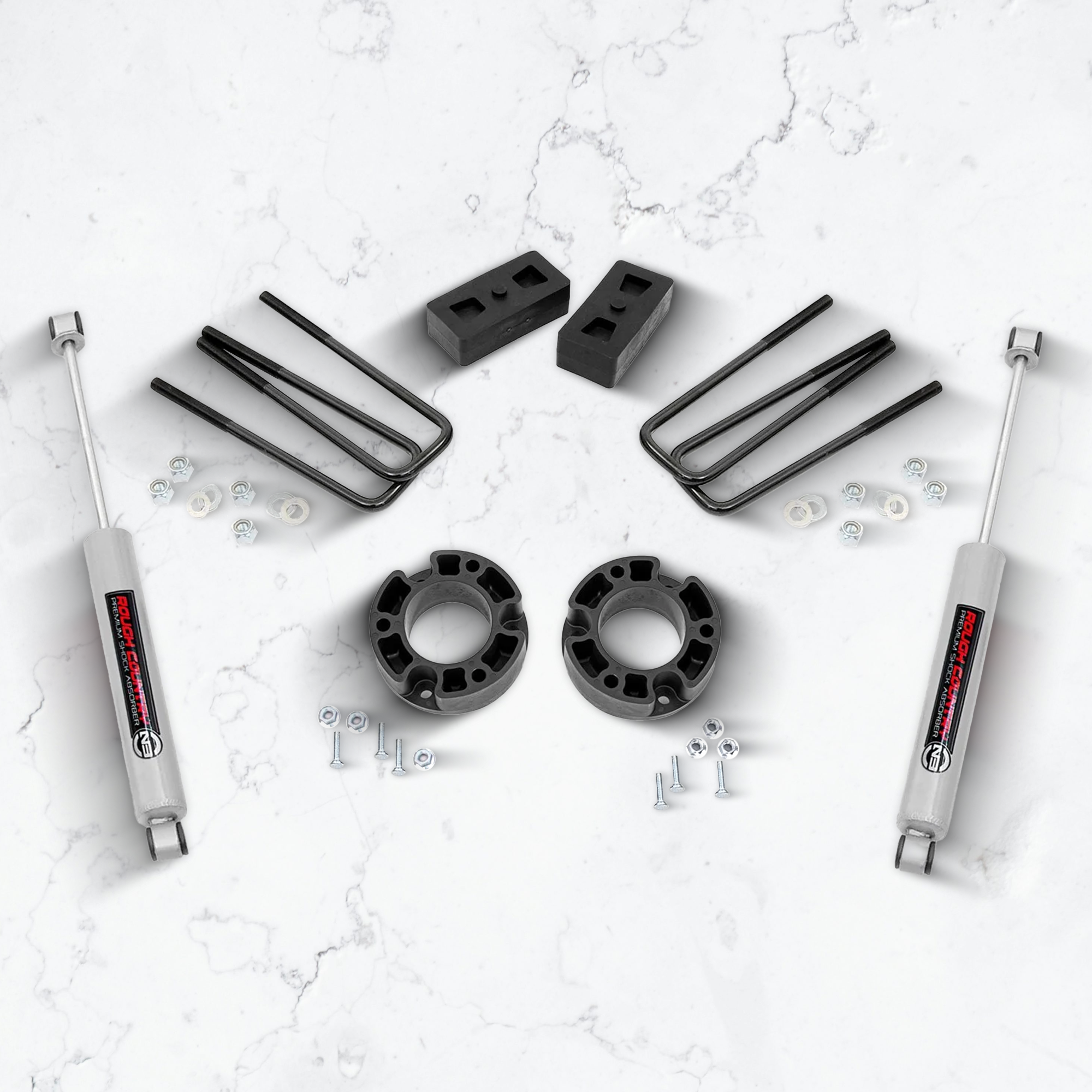 Introducing the redesigned GM 3.5-inch Suspension Lift by Rough Country Suspension Systems with some exciting upgrades to make your off-road experience even better. These updated kits now feature our critically acclaimed N3 shock absorbers and fabricated rear blocks. Our Nitrogen charged N3 Shocks offer the best in balanced performance for on and off-road use, featuring a 10-stage velocity sensitive valving custom tuned for this specific application. That means these shocks are specifically valved for use with this specific vehicle and lift combo, giving you unparalleled performance for any driving situation. Also included in this kit are a set of fabricated rear blocks. Fabricated blocks are stronger and offer a longer lifespan than cast blocks while being less susceptible to damage and the environment.