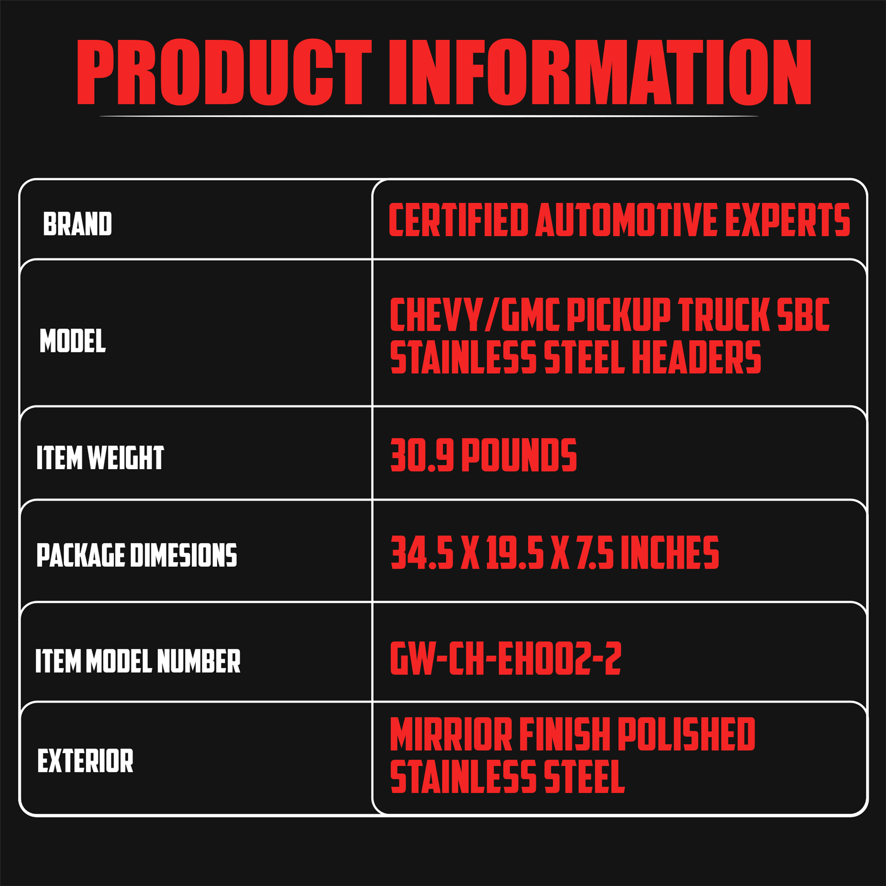 The Certified Automotive Experts GW-CH-EH-002-1-B headers combine classic fitment with modern finish protection. Each set uses precision-formed steel tubing with 1 5/8 inch primaries, 2.5 inch collectors, and CNC-machined 3/8...