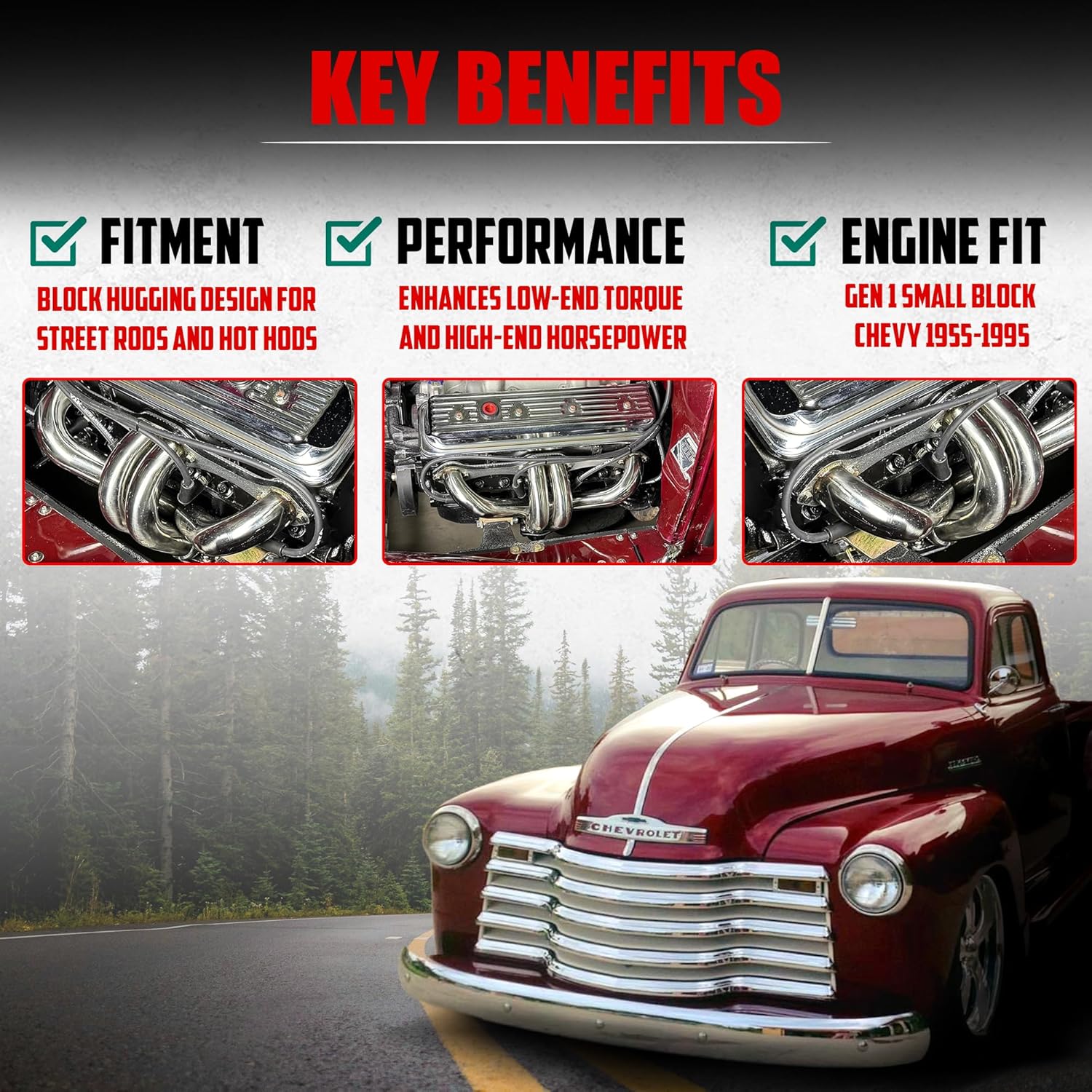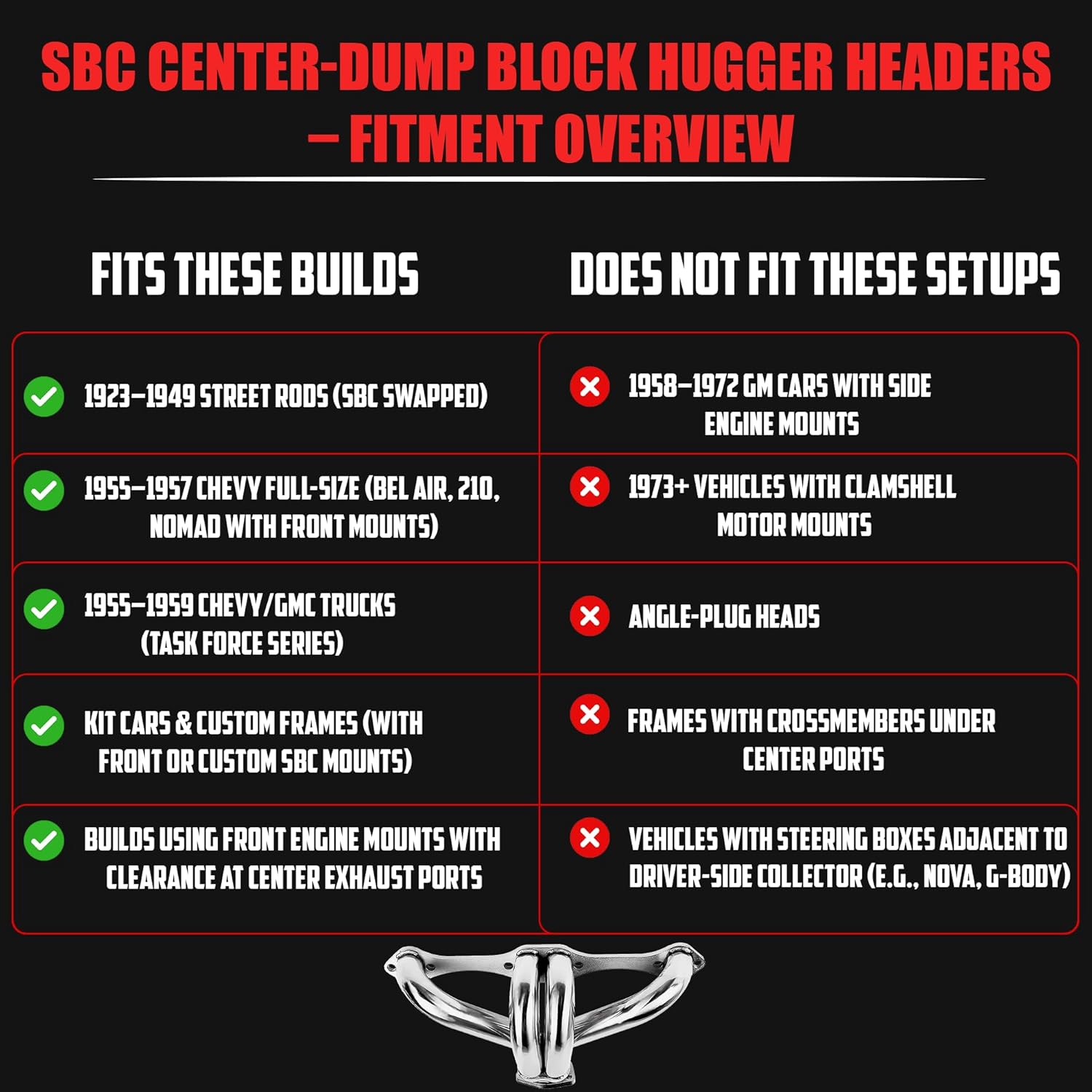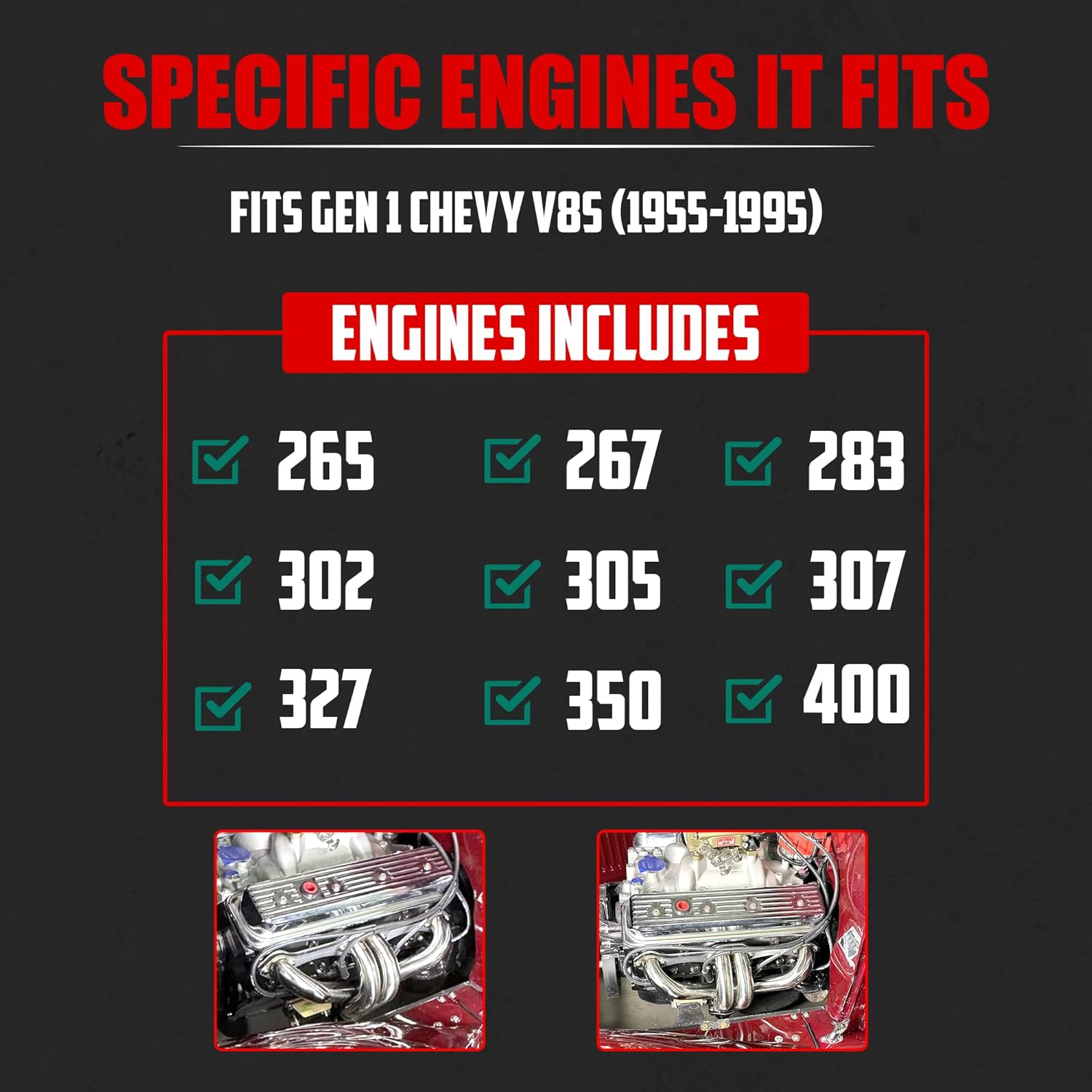 • Fits all Small Block Chevy V8 Engines from 1955-1995 using the standard exhaust pattern - 265, 283, 302, 305, 327, 350, 400