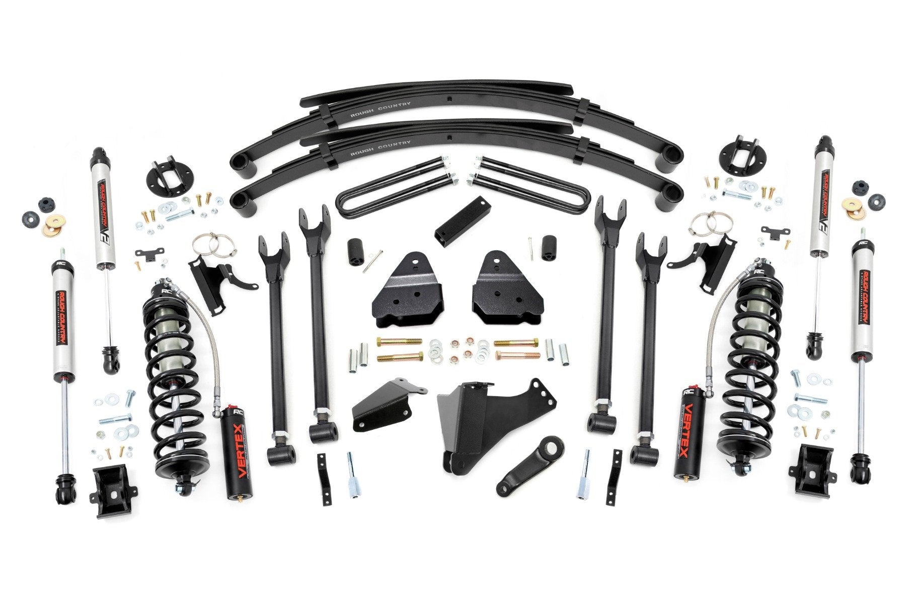 Superior Ride Quality. Give your first-generation Ford Super Duty an impressive upgrade and incredible ride quality with Rough CountryΓÇÖs 4-Link Coilover Conversion Lift Kit! This must-have kit is the pinnacle of suspension upgrades. Providing ride height adjustability, increased dampening, and killer good looks. You're sure to set yourself apart from the pack. This innovative kit allows you to replace your factory arms with a 4-Link setup, using Rough CountryΓÇÖs durable, fixed upper arms and adjustable lower control arms. A set of radius arm drop brackets maintain proper geometry and allow for proper caster setting, which is crucial to maintaining factory handling.\