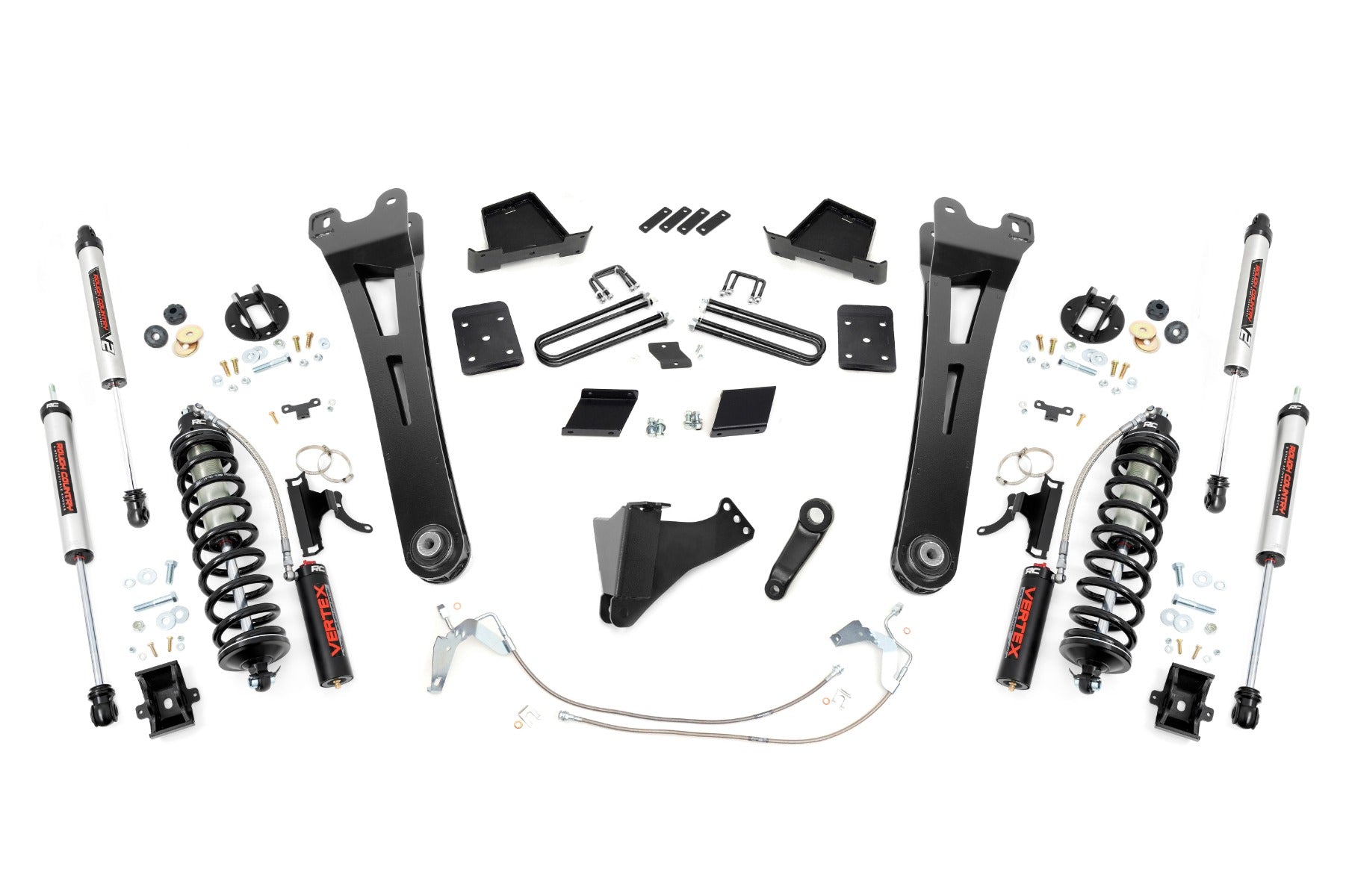 Superior Ride Quality. Take your third-generation Ford Super Duty to new heights with Rough Country's 6-inch Radius Arm Coilover Conversion Suspension Lift! This all-inclusive kit comes with everything you need for a total transformation of your truck. Run up to 37in tires while preserving the smooth, factory ride quality with this impressive upgrade. Durable Components. When changing a vehicle's suspension, the key to preserving ride quality is keeping the geometry of all suspension components as close to their factory angles as possible. Rough Country's new 6-inch Radius Arm Suspension Lift features a set of ultra-durable Radius Arms, precision fit to bolt right into the factory mounts for an easier install and a more factory-like angle. At 27lbs each, these beefy, upgraded Radius Arms dwarf stock equipment and feature durable durable rubber bushings for maximum vibration absorption. Rough CountryΓÇÖs 6" Radius Coilover Conversion Lift Kit features top-mounted reservoir brackets and coil-over mounts constructed from 1/4-inch steel. Utilizing this conversion kit you're removing the factory independent coil shock and coil set-up and replacing it with a massive 2.5in piston, nitrogen-charged, 8-stage adjustable Vertex Coilover. Rough CountryΓÇÖs Vertex Coilovers feature a monotube design with an external reservoir for increased oil capacity and damping sensitivity. When it comes to investing in a high-end kit, youΓÇÖll be pleased to find that Rough CountryΓÇÖs 2.5in piston design is beefier and offers an impressive 56% greater fluid capacity than the average reservoir shock. Each kit is paired with a monotube shock that provides optimal damping control. Installation. Requiring cutting and drilling to install, an estimated timeframe of 6-10 hours is recommended to complete this full installation. This full kit can be installed at home and can be completed efficiently and quickly! Limited Lifetime Replacement Warranty. Rough Country's 6-inch Radius Arm Coilover Conversion Suspension Lift Kit is backed with a limited lifetime replacement warranty towards manufacturer defects. As such, the product is protected from structural and workmanship damage after the date of purchase. With our industry-leading warranty give yourself peace of mind when using Rough Country's Suspension products!