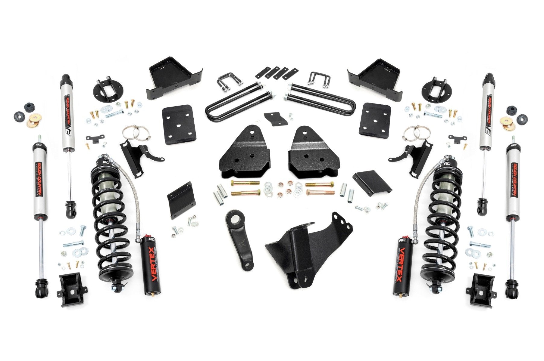 Durable Components. When changing a vehicle's suspension, the key to preserving ride quality is keeping the geometry of all suspension components as close to their factory angles as possible. Rough Country's new 6-inch Suspension Lift features a set of ultra-durable radius arm drop brackets, precision fit to bolt right into the factory mounts for an easier install and a more factory-like angle. Utilizing this conversion kit you're removing the factory independent coil shock and coil set-up and replacing it with a massive 2.5in piston, nitrogen-charged, 8-stage adjustable Vertex Coilover. Rough CountryΓÇÖs Vertex Coilovers feature a monotube design with an external reservoir for increased oil capacity and damping sensitivity. When it comes to investing in a high-end kit, youΓÇÖll be pleased to find that Rough CountryΓÇÖs 2.5in piston design is beefier and offers an impressive 56% greater fluid capacity than the average reservoir shock. Each kit is paired with a monotube shock that provides optimal damping control.\
