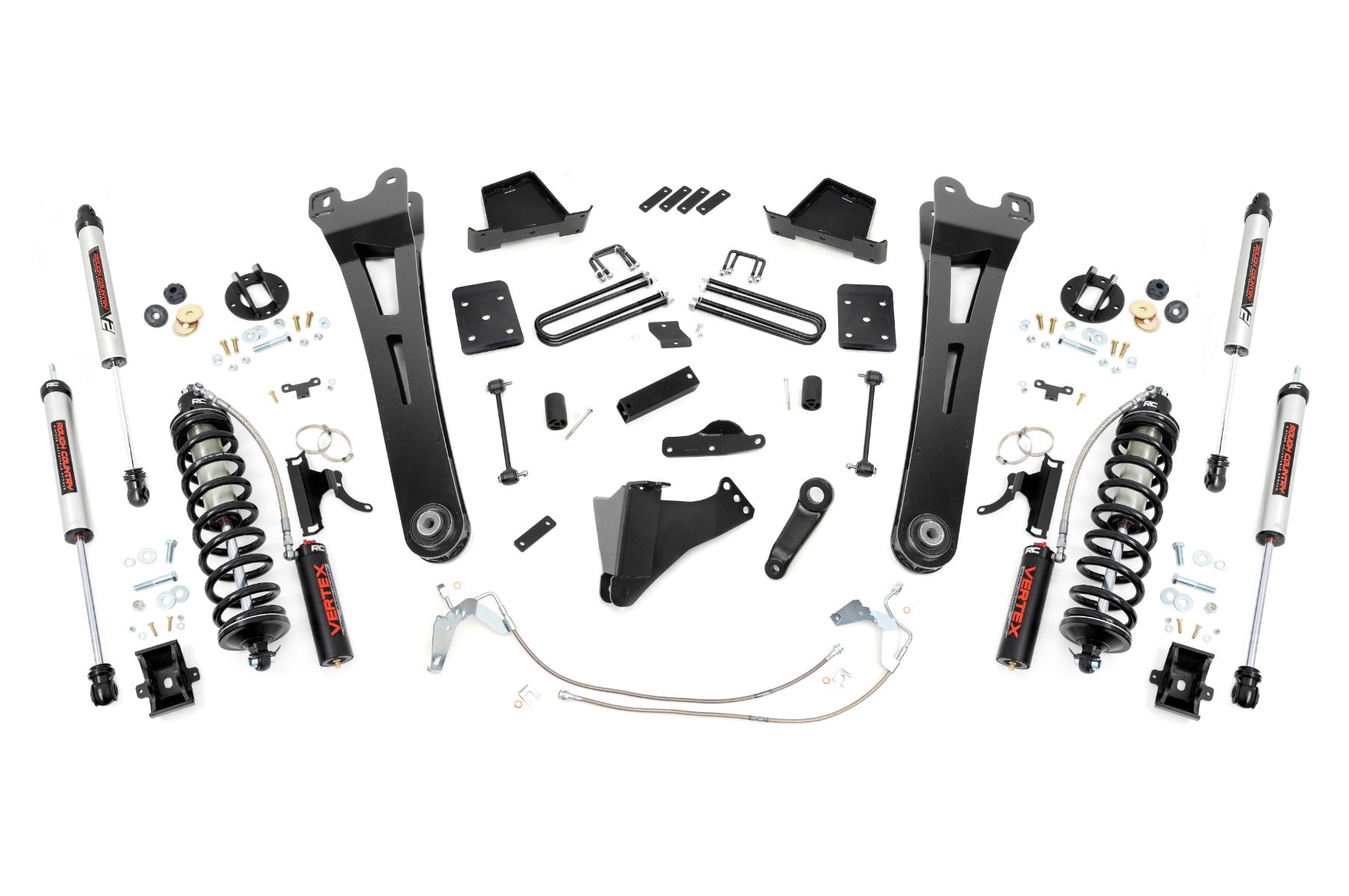 Superior Ride Quality. Take your second-generation Ford Super Duty to new heights with Rough Country's 6-inch Radius Arm Coilover Conversion Suspension Lift! This all-inclusive kit comes with everything you need for a total transformation of your truck. Run up to 37in tires while preserving the smooth, factory ride quality with this impressive upgrade. Durable Components. When changing a vehicle's suspension, the key to preserving ride quality is keeping the geometry of all suspension components as close to their factory angles as possible. Rough Country's new 6-inch Radius Arm Suspension Lift features a set of ultra-durable Radius Arms, precision fit to bolt right into the factory mounts for an easier install and a more factory-like angle. At 27lbs each, these beefy, upgraded Radius Arms dwarf stock equipment and feature durable durable rubber bushings for maximum vibration absorption. Rough CountryΓÇÖs 6" Radius Coilover Conversion Lift Kit features top-mounted reservoir brackets and coil-over mounts constructed from 1/4-inch steel. Utilizing this conversion kit you're removing the factory independent coil shock and coil set-up and replacing it with a massive 2.5in piston, nitrogen-charged, 8-stage adjustable Vertex Coilover. Rough CountryΓÇÖs Vertex Coilovers feature a monotube design with an external reservoir for increased oil capacity and damping sensitivity. When it comes to investing in a high-end kit, youΓÇÖll be pleased to find that Rough CountryΓÇÖs 2.5in piston design is beefier and offers an impressive 56% greater fluid capacity than the average reservoir shock. Each kit is paired with a monotube shock that provides optimal damping control. Installation. Requiring cutting and drilling to install, an estimated timeframe of 6-10 hours is recommended to complete this full installation. This full kit can be installed at home and can be completed efficiently and quickly! Limited Lifetime Replacement Warranty. Rough Country's 6-inch Radius Arm Coilover Conversion Suspension Lift Kit is backed with a limited lifetime replacement warranty towards manufacturer defects. As such, the product is protected from structural and workmanship damage after the date of purchase. With our industry-leading warranty give yourself peace of mind when using Rough Country's Suspension products!