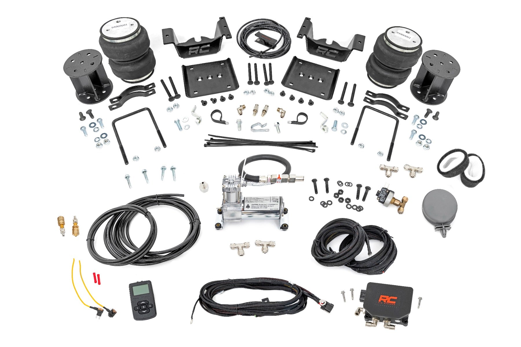 Ideal Leveling. Is your truck your workhorse? The main attraction to the pick-up line is the accessibility to haul and tow as desired. However, due to the amount of weight in the bed, or the condition of the vehicle's rear leaf springs, this can cause the vehicle to be un-level when under load. Here at Rough Country, we created an innovative new product to ensure that these are troubles of the past. Introducing, Rough Country's Rear Air Spring Kit.Heavy-duty Construction. Rough Country's Rear Air Spring Kit features two RC branded high-quality double convoluted airbags complemented with DOT-approved airlines. Whether you plan on towing or hauling in the not-so-distant future Rough Country's Air Spring kit is the must-have accessory to ensure that your trailer is level reducing the weight off of the tongue of your trailer.  Each kit offers 1/4" push connector fittings and all of the bracketry needed to ensure installation is lightning fast and secure! Rough Country's Air Spring kit provides up to 5,000 lbs of load support to ensure that you experience less sway and bottoming out when braking and steering! \