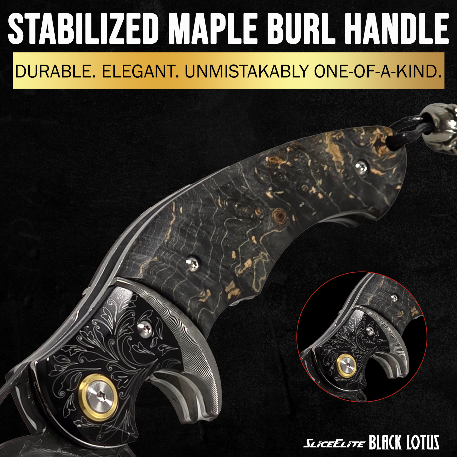 Each handle is made from stabilized maple burl wood, with naturally occurring grain patterns and smooth shaping for comfort and durability. Whether you’re adding to your collection or need a dependable pocket knife, the Black Lotus brings refined design to practical use.