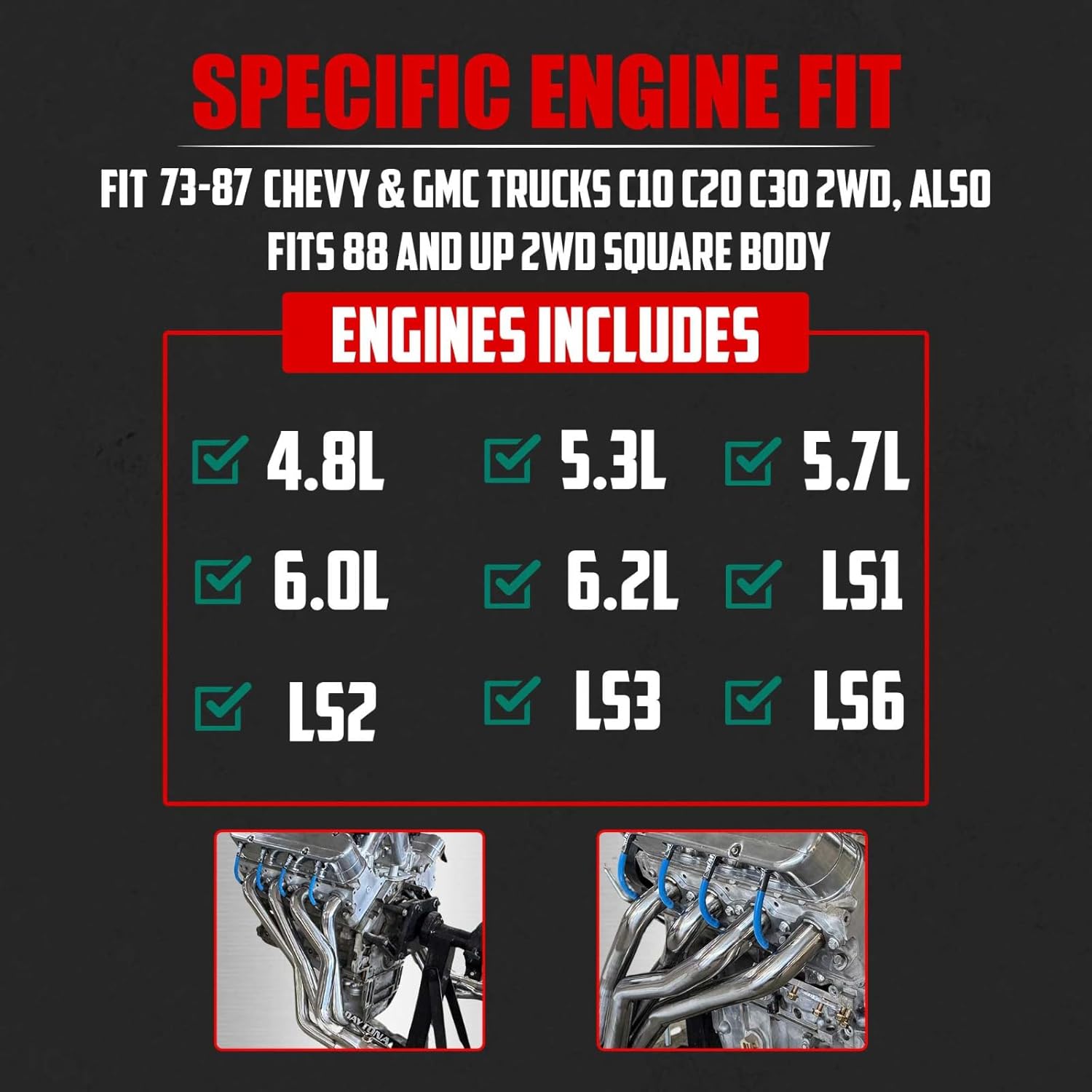 For LS series engine swaps only. Not for use on trucks originally equipped with LS stleye engine. These do not work on standard SBC or BBC engines. If using a larger 4L80E or older Turbo 350/400 transmission the bellhousing ears may need to be trimmed for proper clearance.
