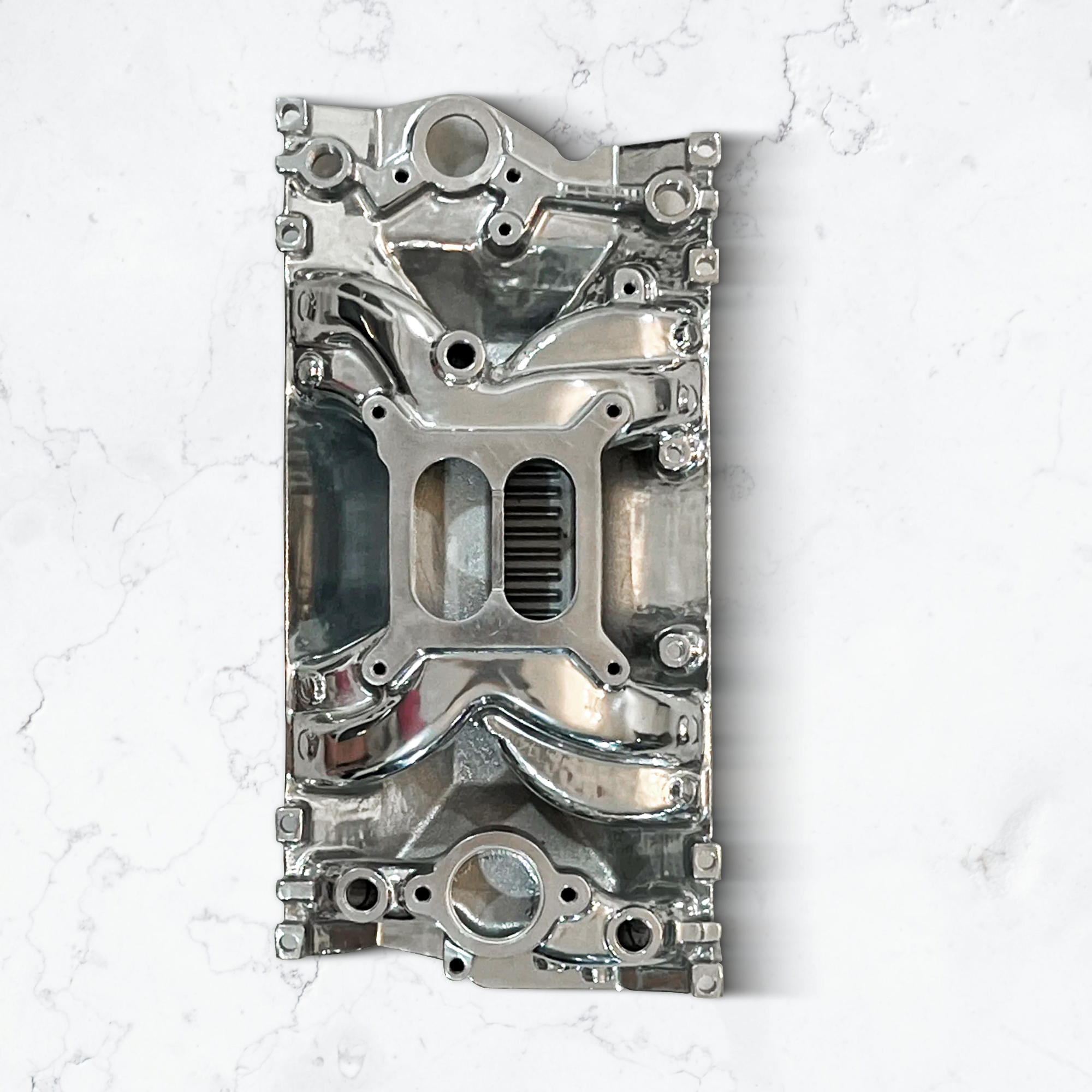 Polished Aluminum Dual Plane Air Gap Intake Manifold. Fits 1996-up SBC Chevy 350 (5.7L) Vortec engines.