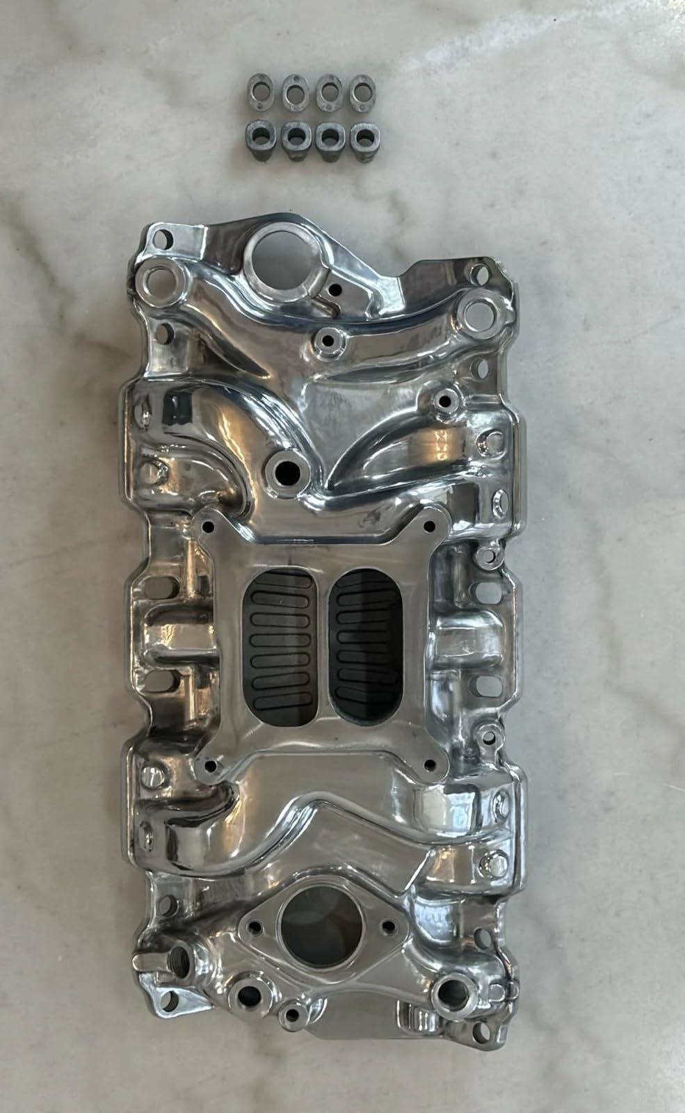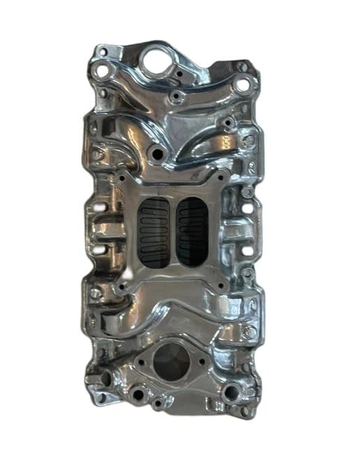 Polished Aluminum Intake Manifold for Small Block Chevy. This is a mid rise, dual plane style manifold. It has a square bore carburetor flange that accepts 4150/4160 style carburetors. Fits 55-95 engines.