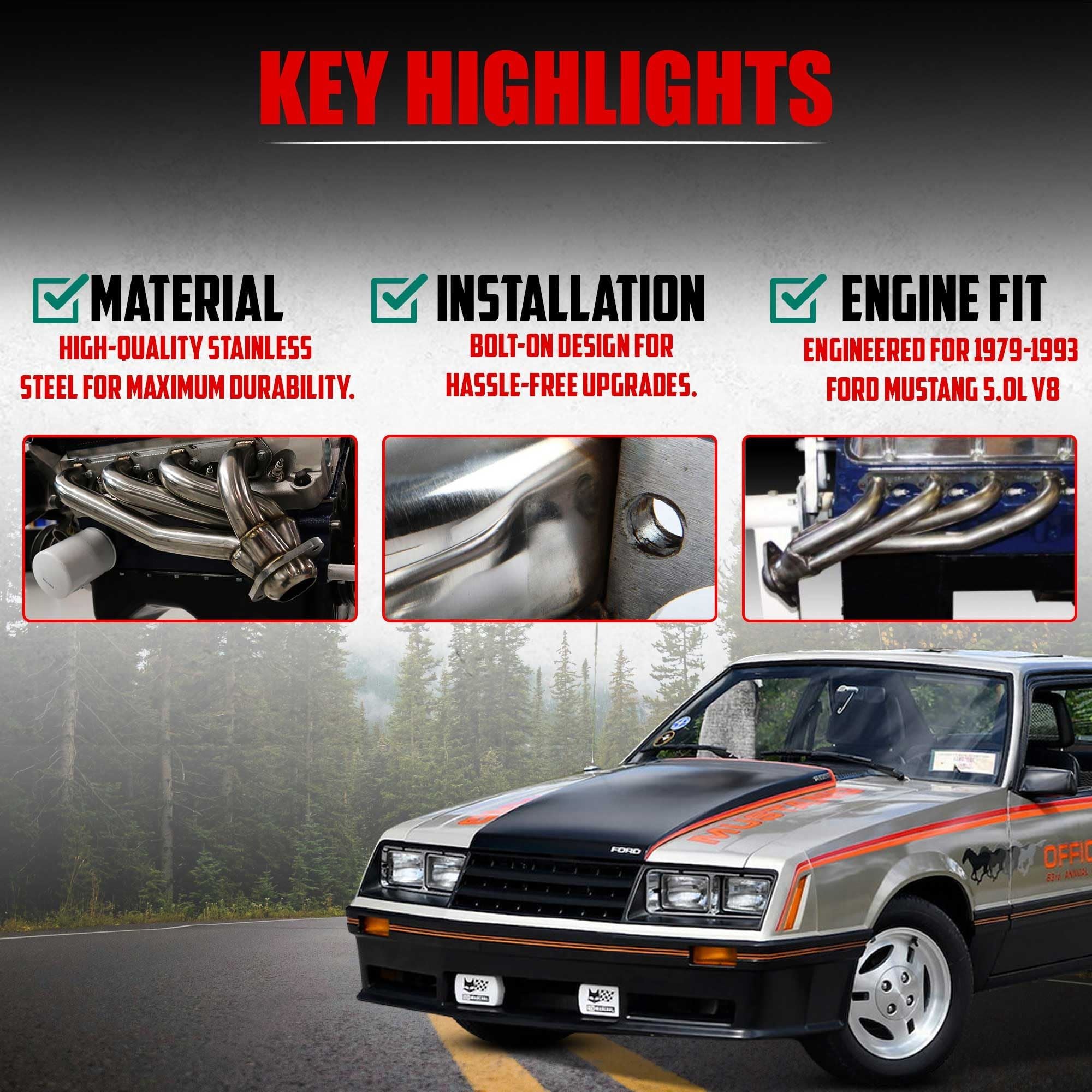 Transform your 1979-1993 Ford Mustang with our high-performance stainless steel shorty headers. Engineered for the 5.0L V8 (302 ci engines), these direct fit bolt-on replacement headers are designed to deliver exceptional horsepower, torque, and overall performance. With a polished surface, our headers offer superior resistance against rust, ensuring durability and...