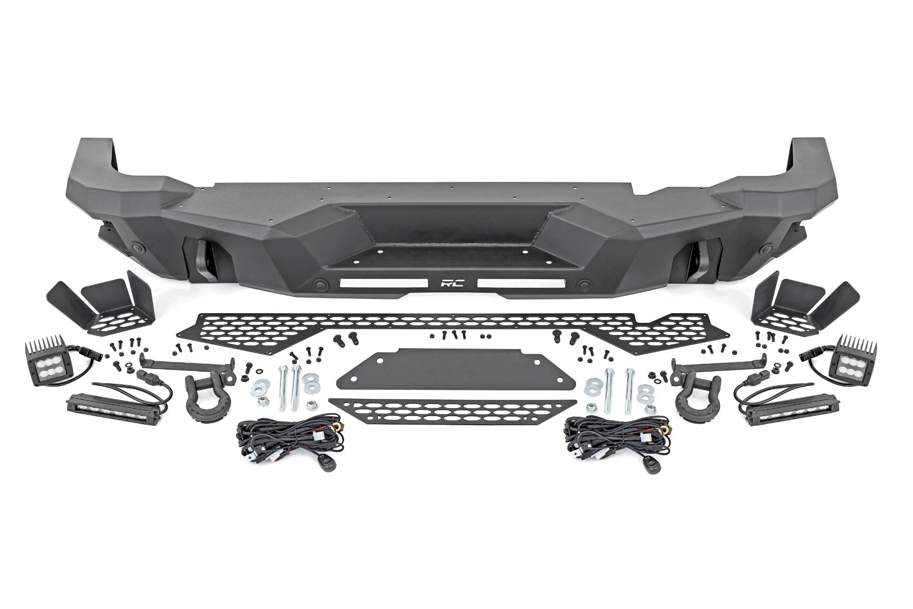 Superior Durability. Made of heavy-duty steel construction, our Rear FAB Bumper is an easy way to add off-road style and functionality to the back of your Bronco. The Rough Country Bumper includes additional LED lighting for those nighttime rides, a License Plate Relocation kit, and works with the RC or factory hitch. No hitch? No problem! It even comes with a shim plate for vehicles without a hitch.\