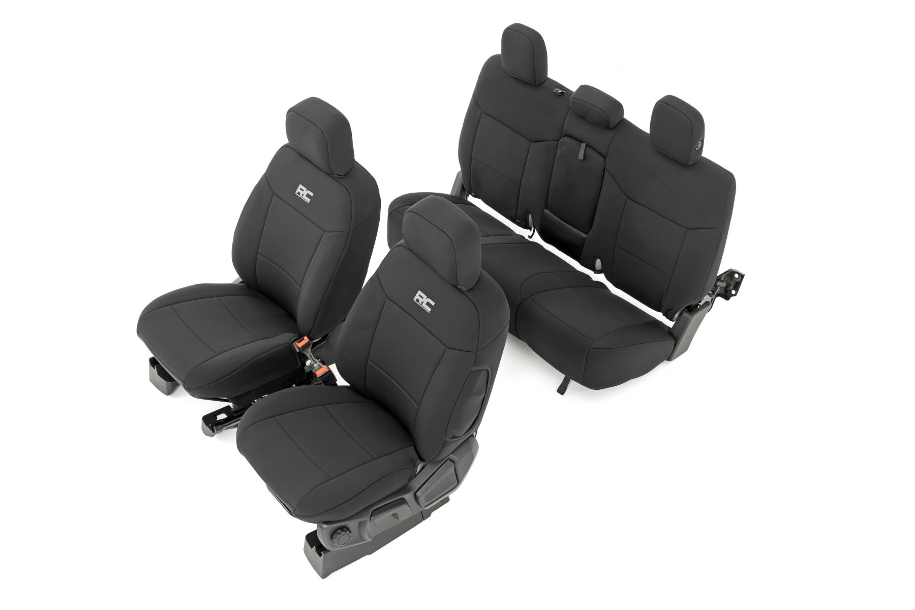 Want to protect your seats or are your seats showing signs of wear and tear from daily use? Say goodbye to unsightly stains and deterioration with Rough Country's Neoprene Seat Covers - the ultimate solution for preserving your vehicle's interior. Snug Fit for Optimal Protection: Our seat covers are tailored to fit your seats perfectly, providing a protective barrier against spills, scratches, and everyday wear and tear. Factory-Spec Construction: Engineered to meet factory specifications, our covers blend seamlessly with your vehicle's interior, giving it a fresh, new look without compromising on quality or style. Four-Layer Defense: With a four-layer construction featuring foam padding and a durable polyester shell, our seat covers offer unmatched protection and longevity, ensuring your seats stay looking new for years to come. Breathable and Water-Resistant: The neoprene layer not only provides breathability for added comfort but also boasts water-resistant properties, safeguarding your seats from spills and stains. Complete Coverage: Our covers come with full protection for your front seats, including headrest covers where applicable, as well as rear covers to shield your back seats from children and pet-related mishaps. Peace of Mind Warranty: Rest easy knowing your purchase is backed by our two-year warranty, giving you confidence in the durability and reliability of our product. Don't let worn-out seats diminish your driving experience. Upgrade to Neoprene Seat Covers today and enjoy a fresh, stylish interior that's protected against the rigors of daily life on the road.